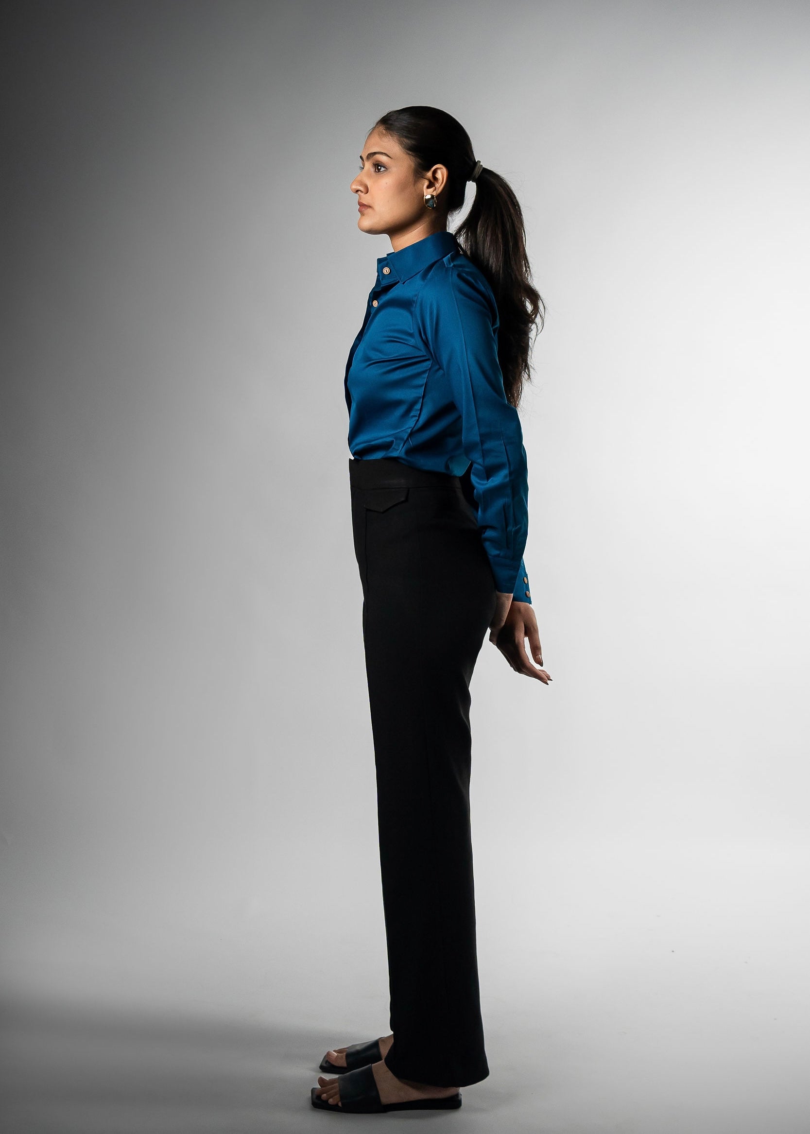 A full-sleeve blue shirt with a tailored fit and button-up front—perfect for smart, timeless dressing.