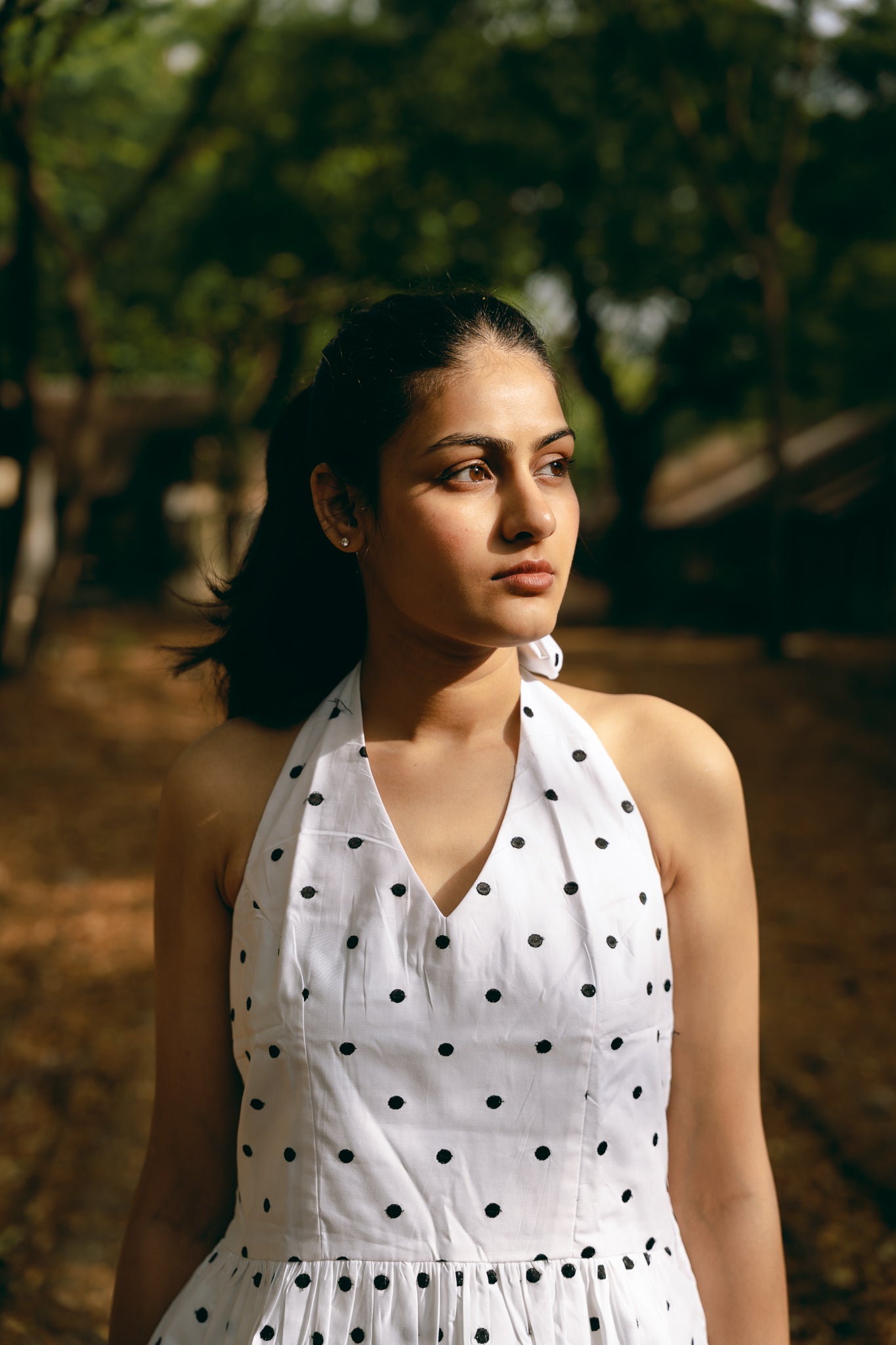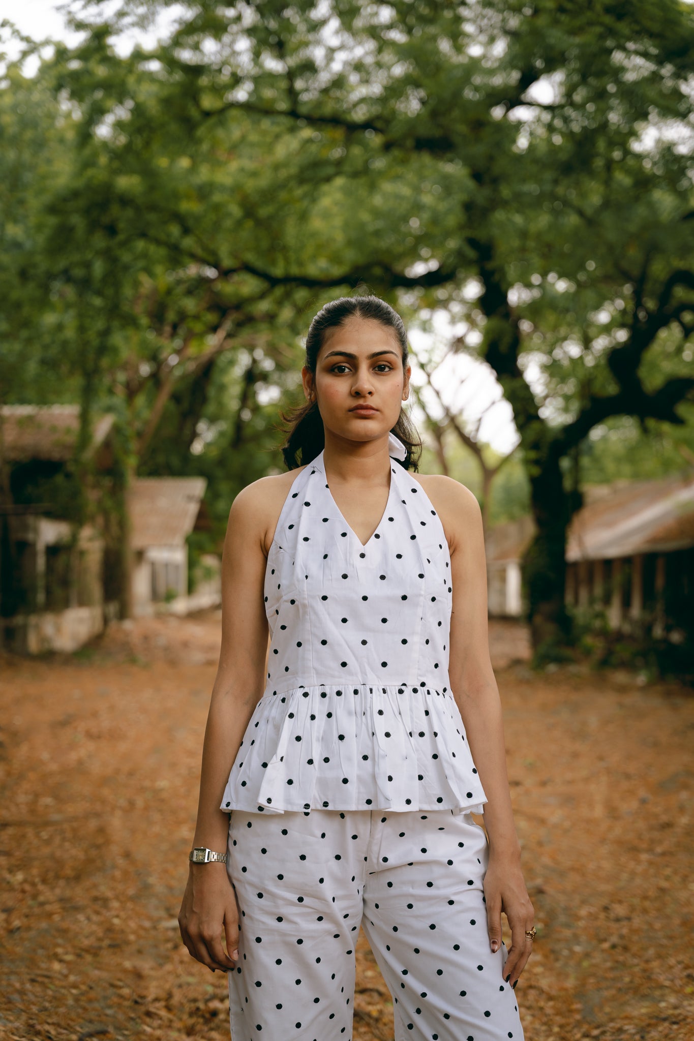 Halter tie peplum top with side zip fastening. Polka dots embroidery.