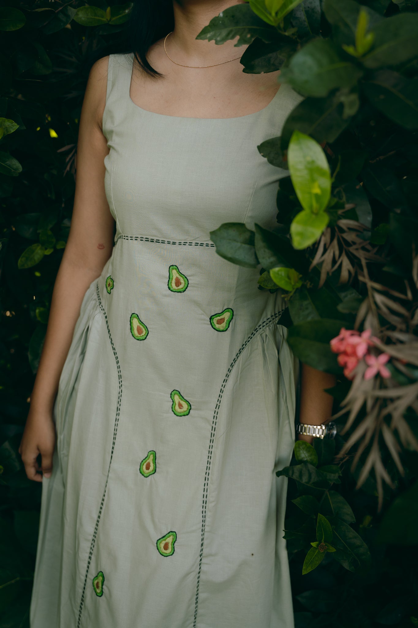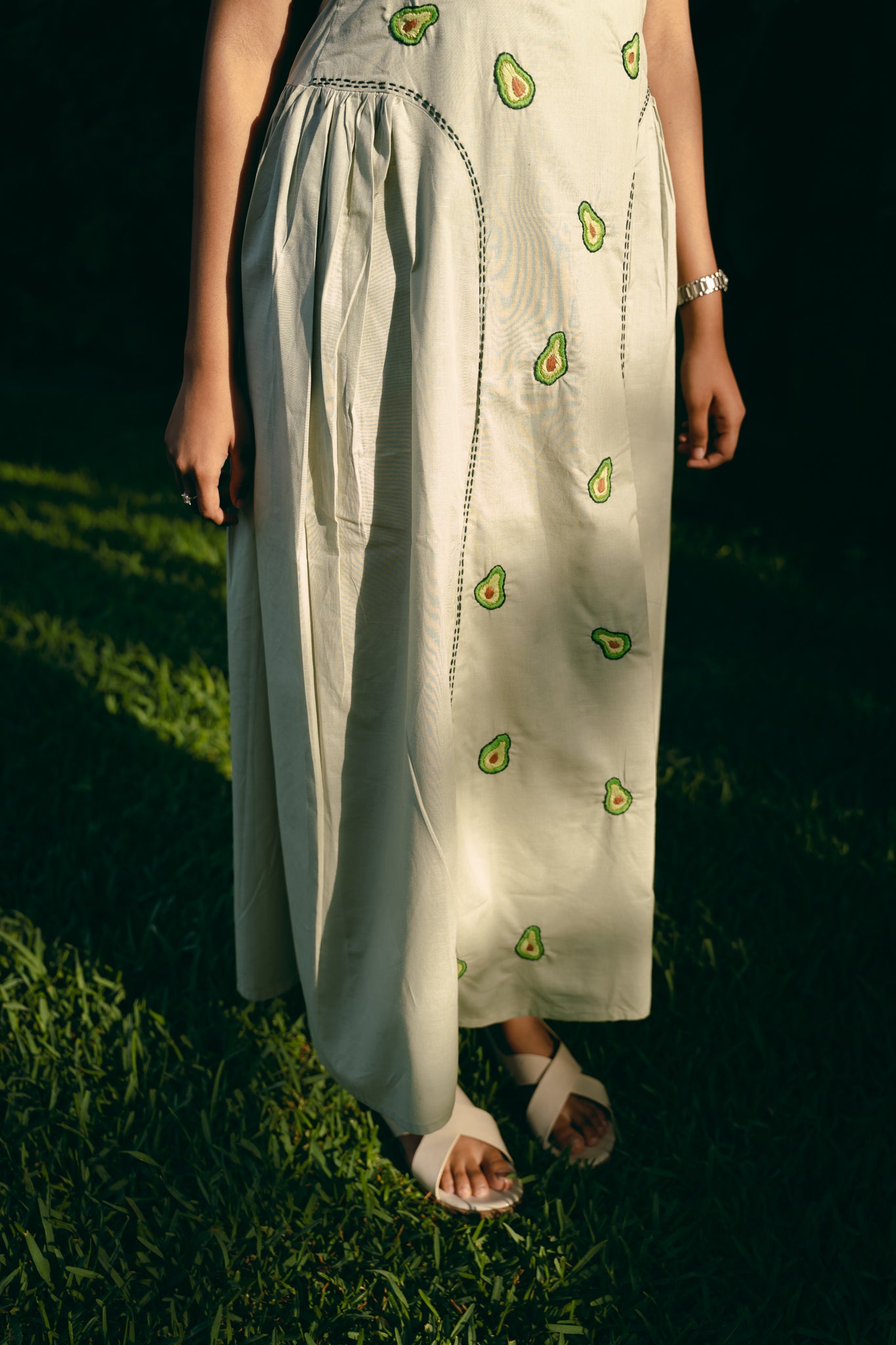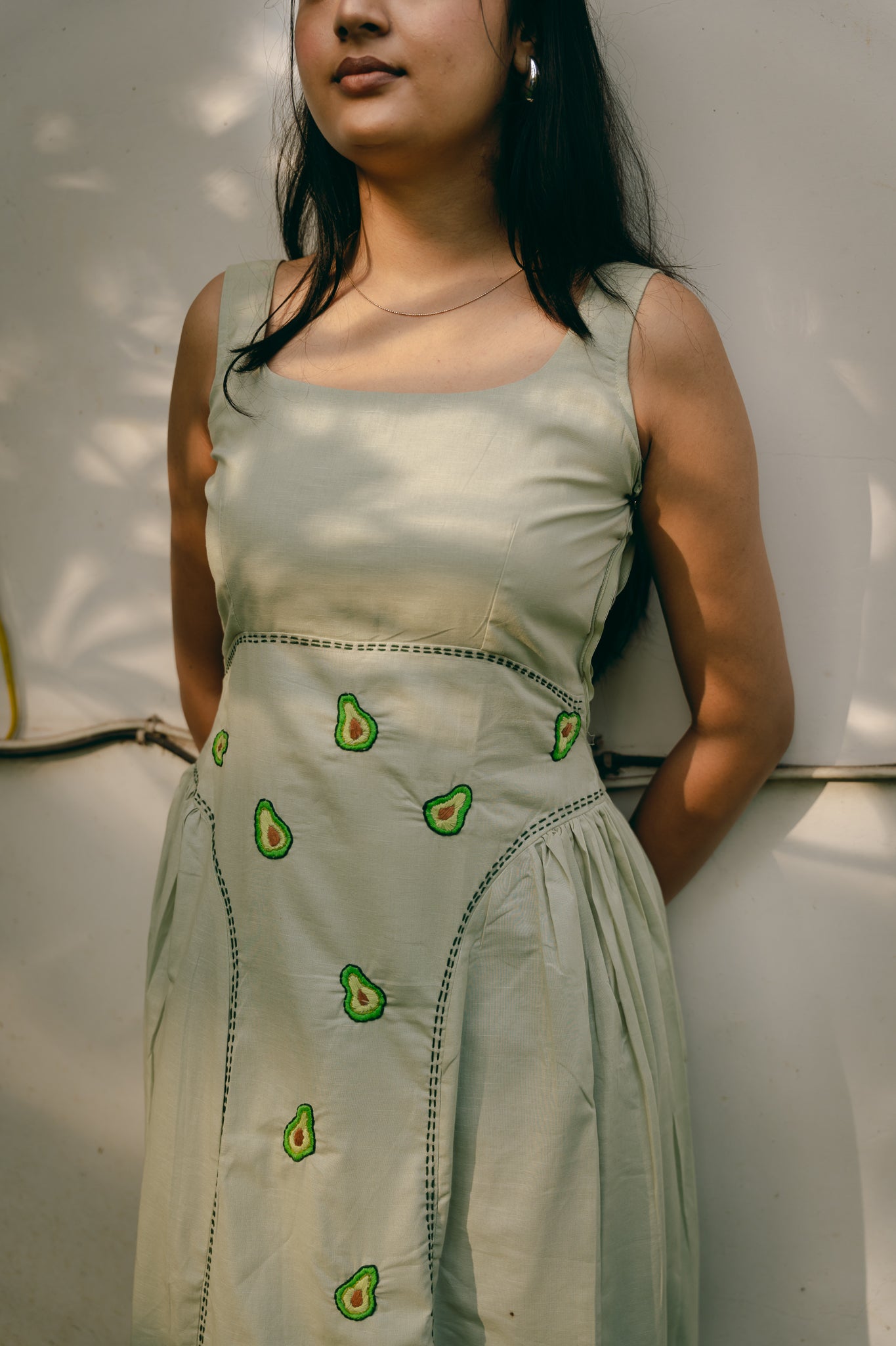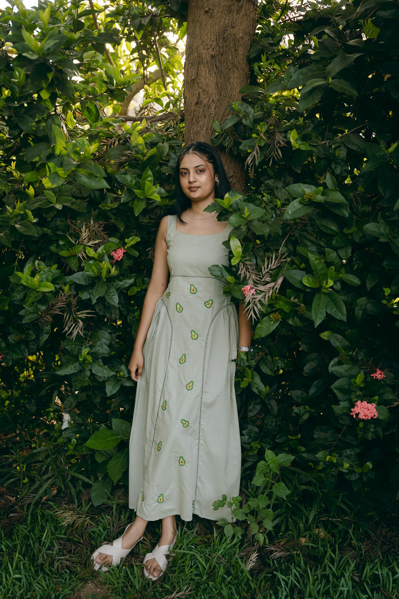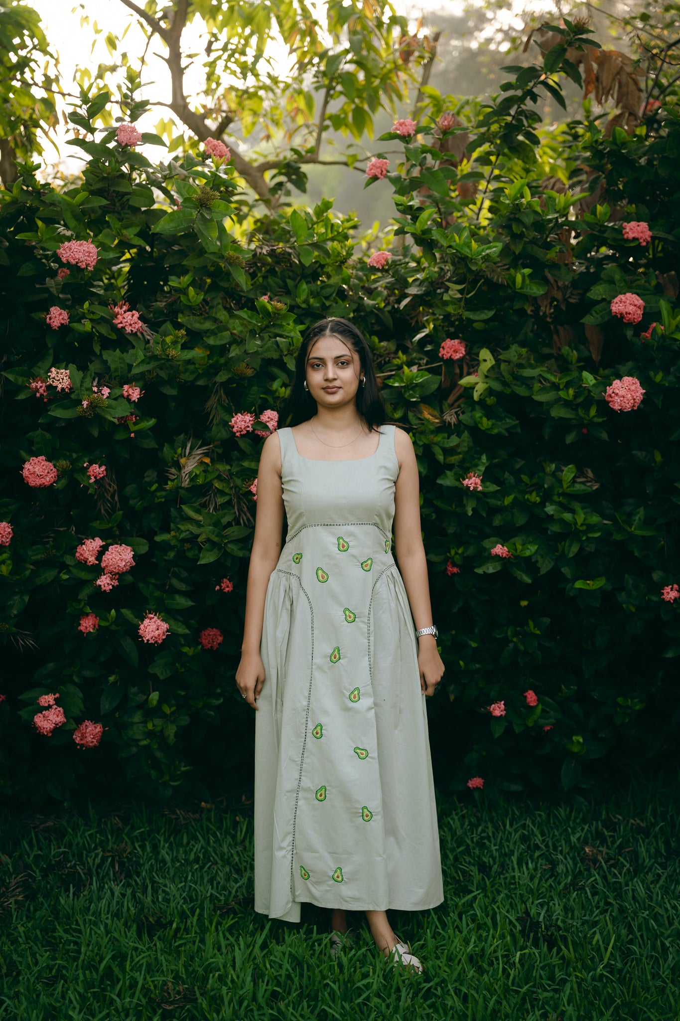 A sleeveless, square neck dress with gathering around low waist. Hand embroidered and side zip fastening.