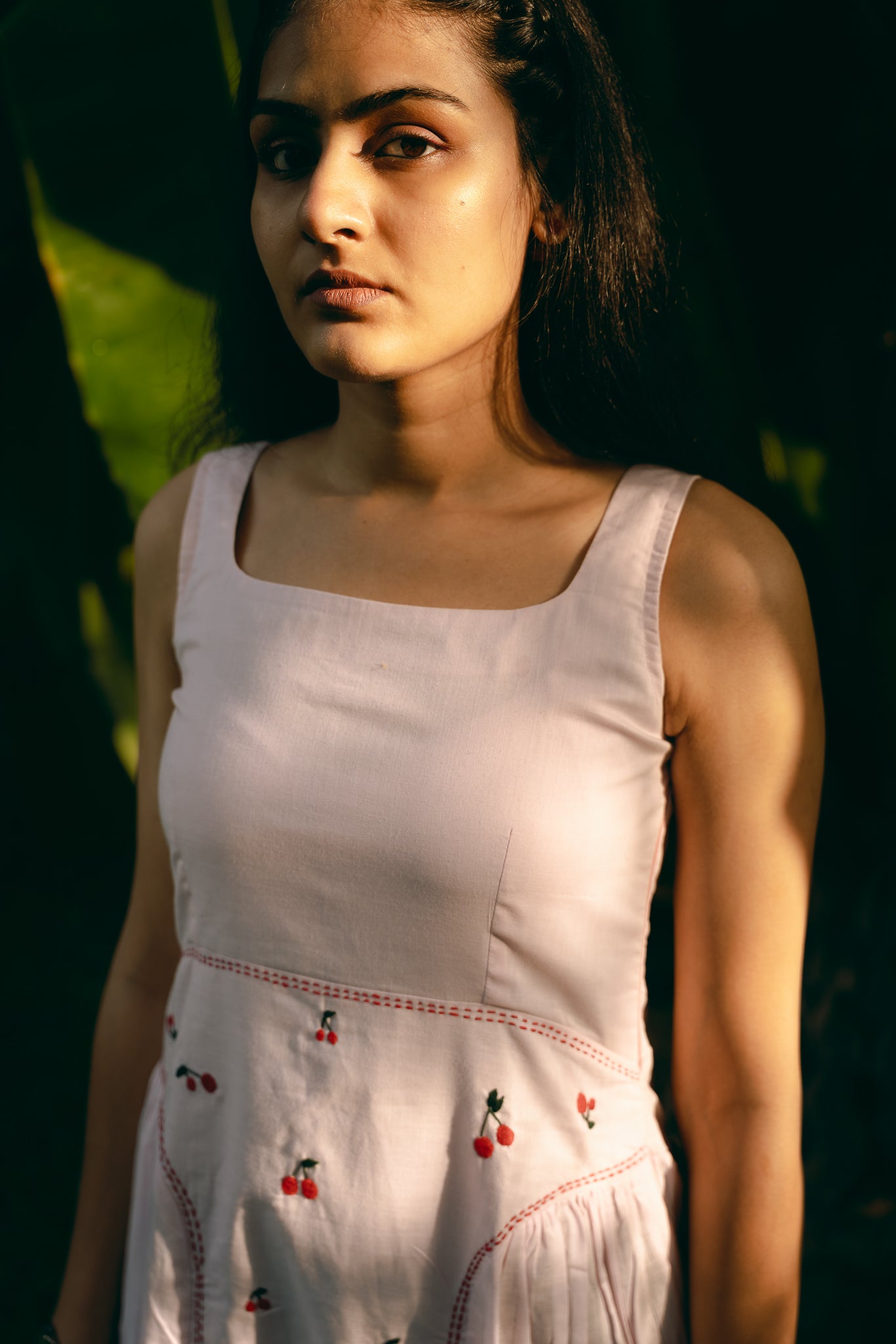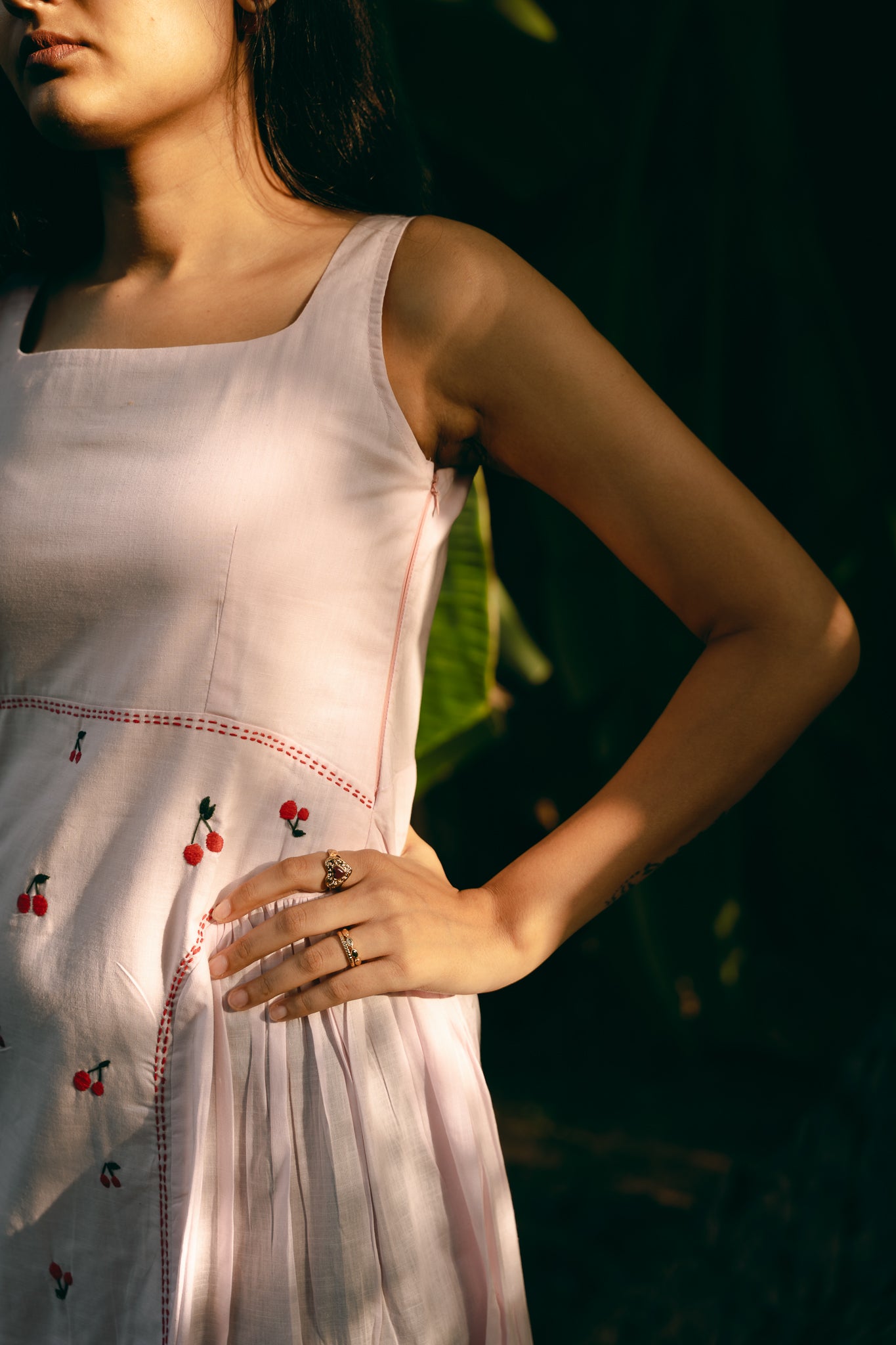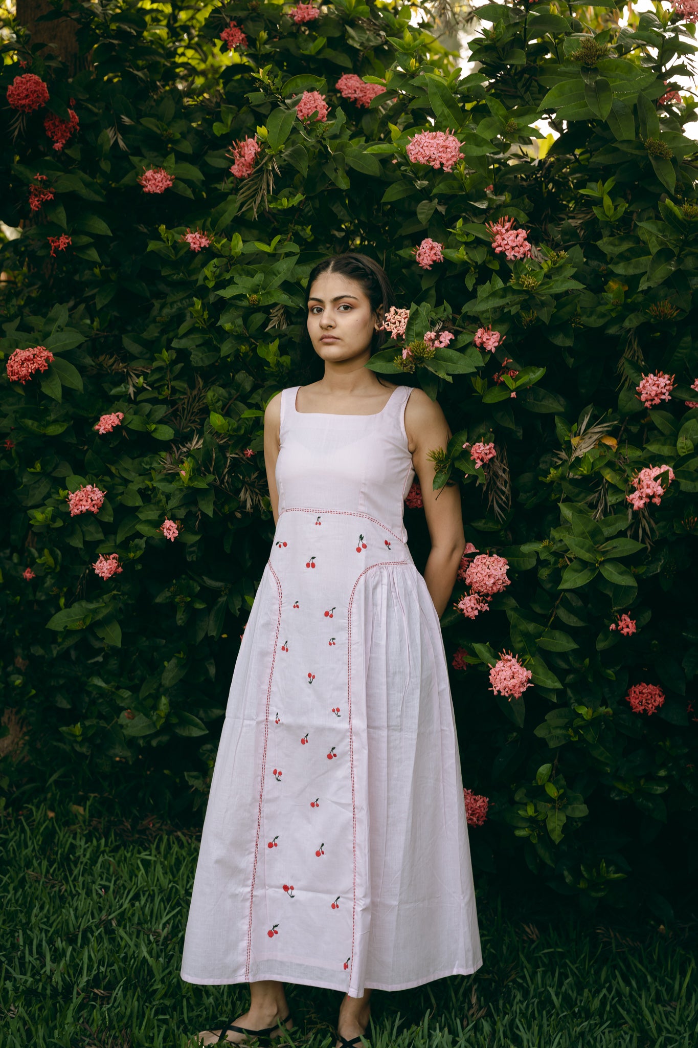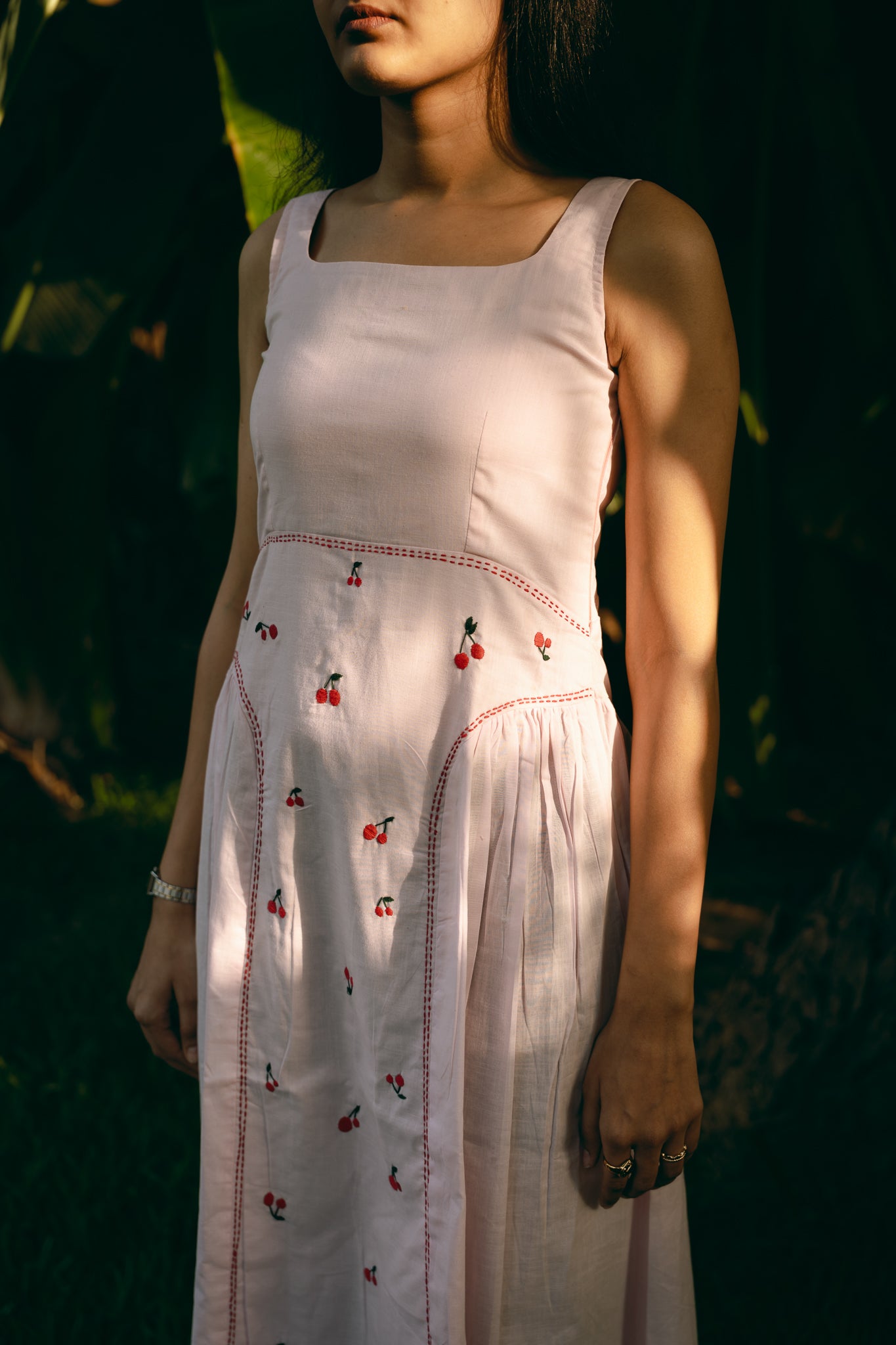 A sleeveless, square neck dress with gathering around low waist. Hand embroidered and side zip fastening.
