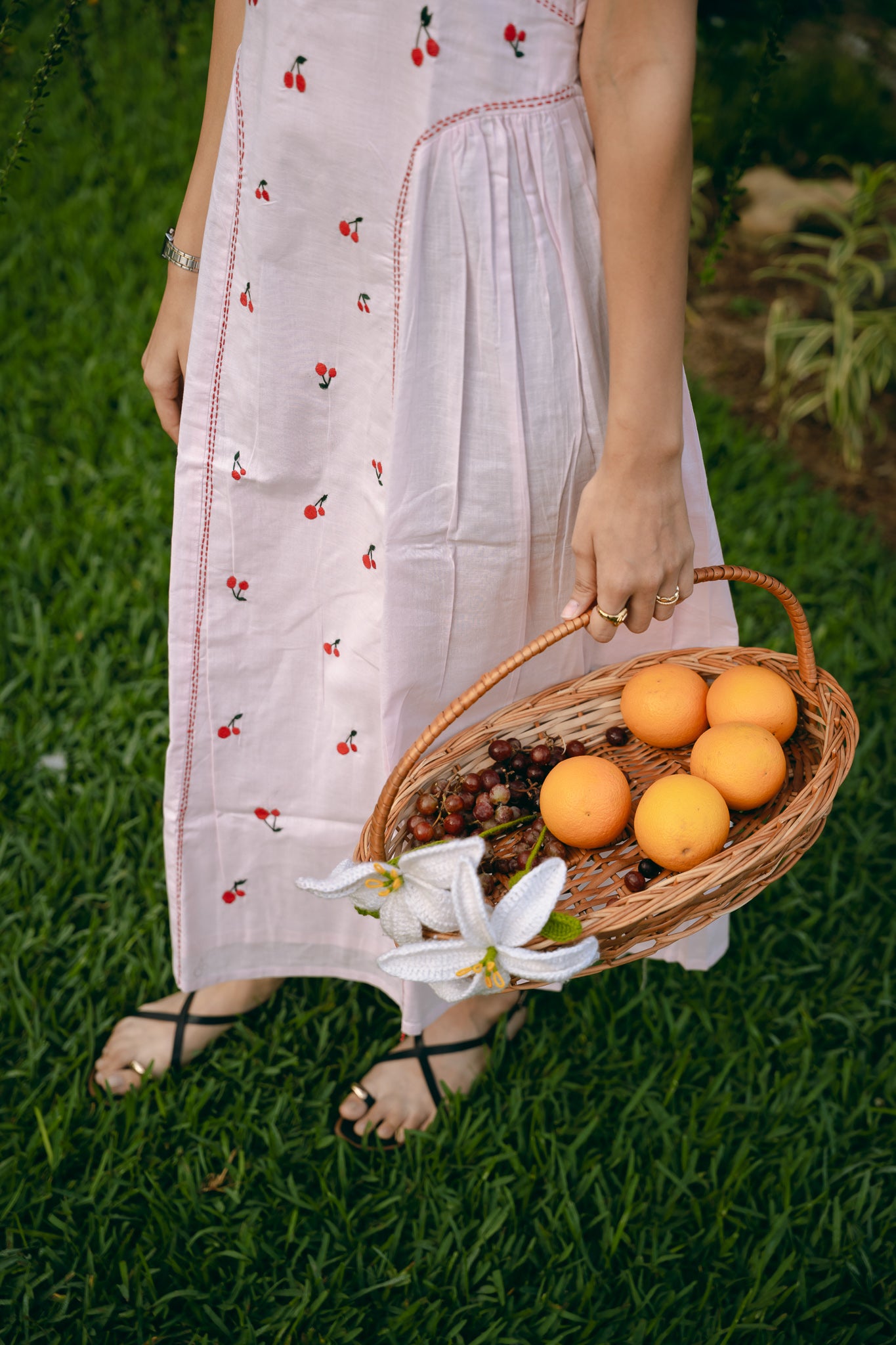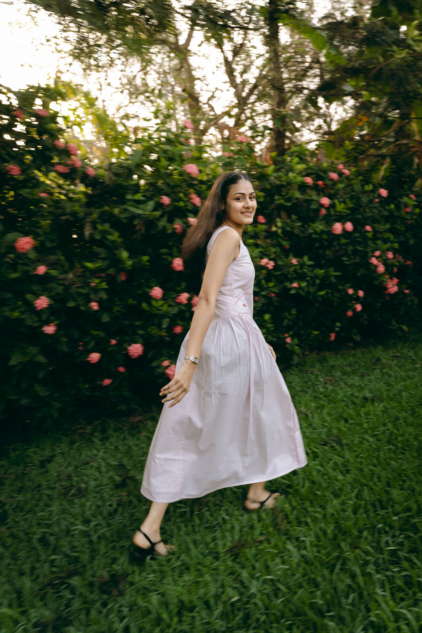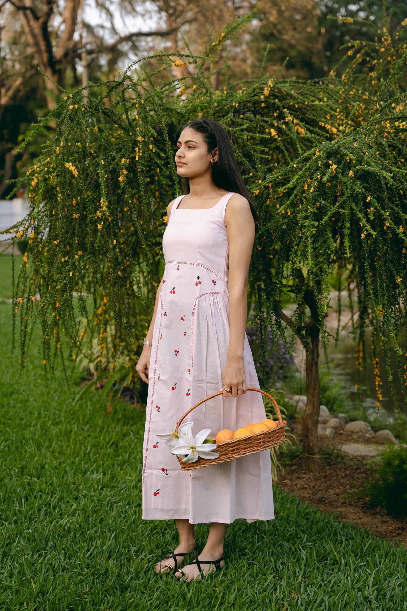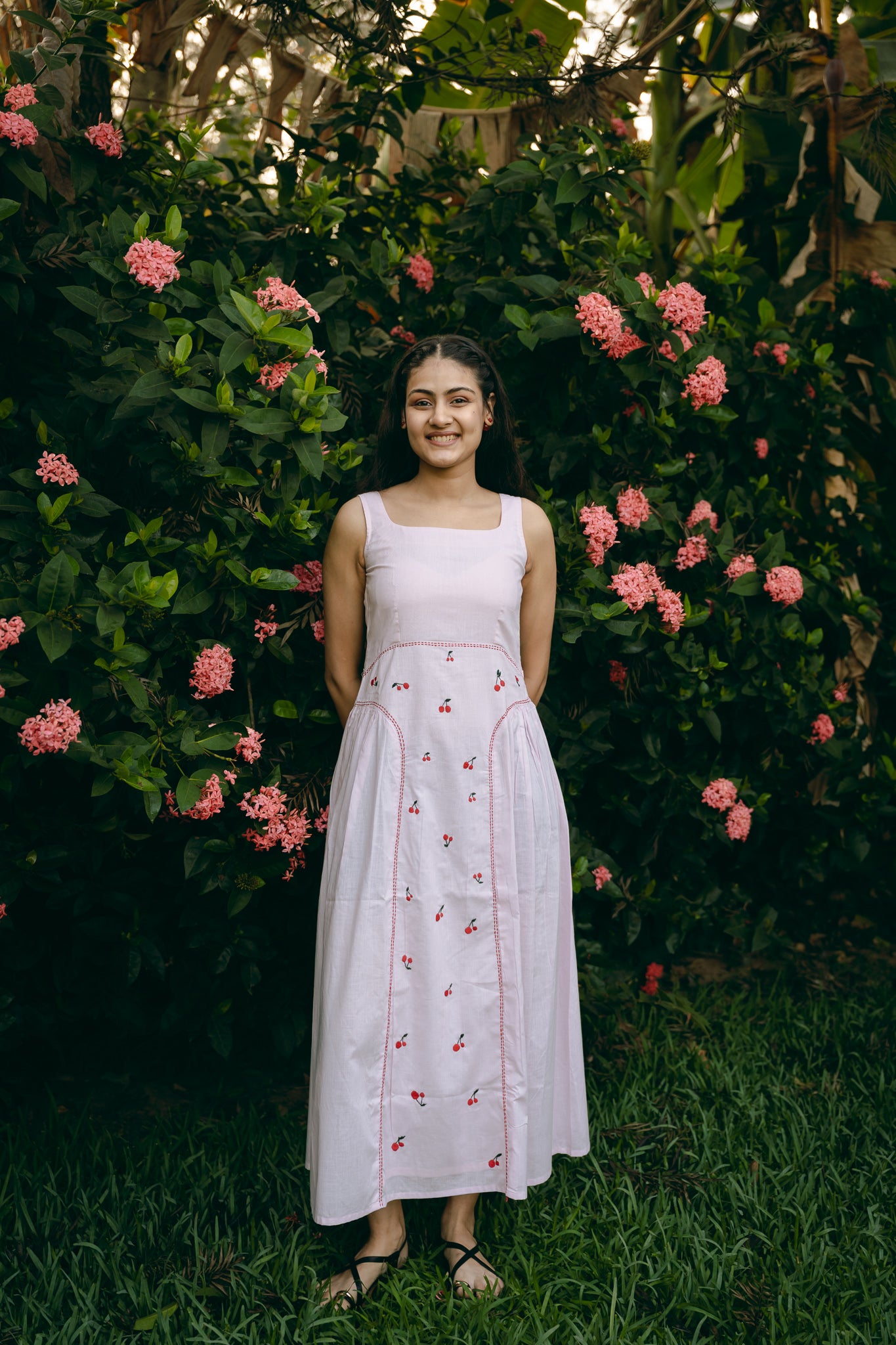 A sleeveless, square neck dress with gathering around low waist. Hand embroidered and side zip fastening.