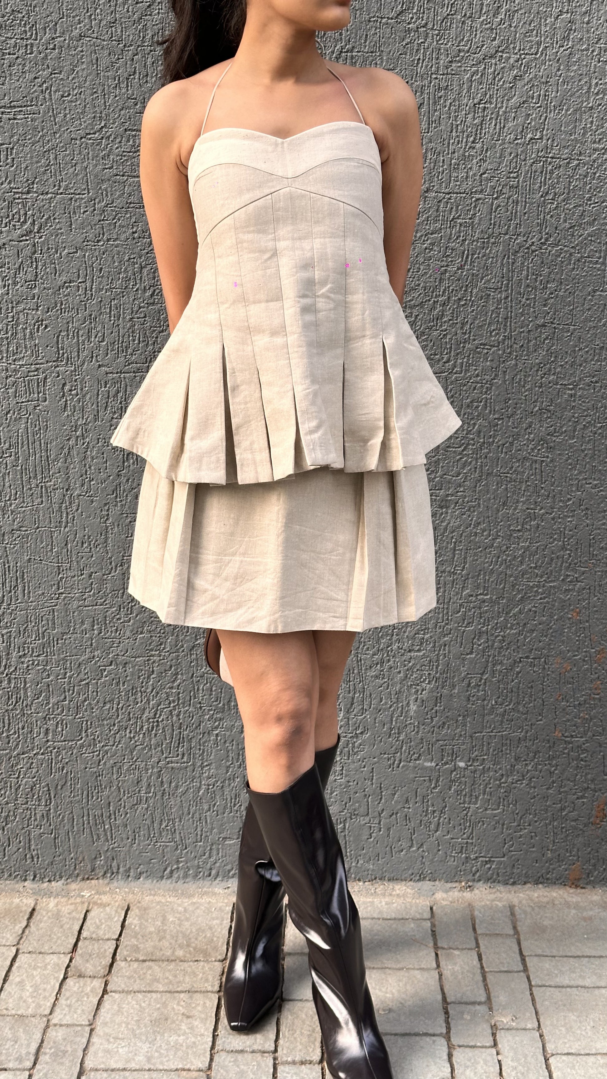 Structured pleated skirt. Side zip fly closing.
