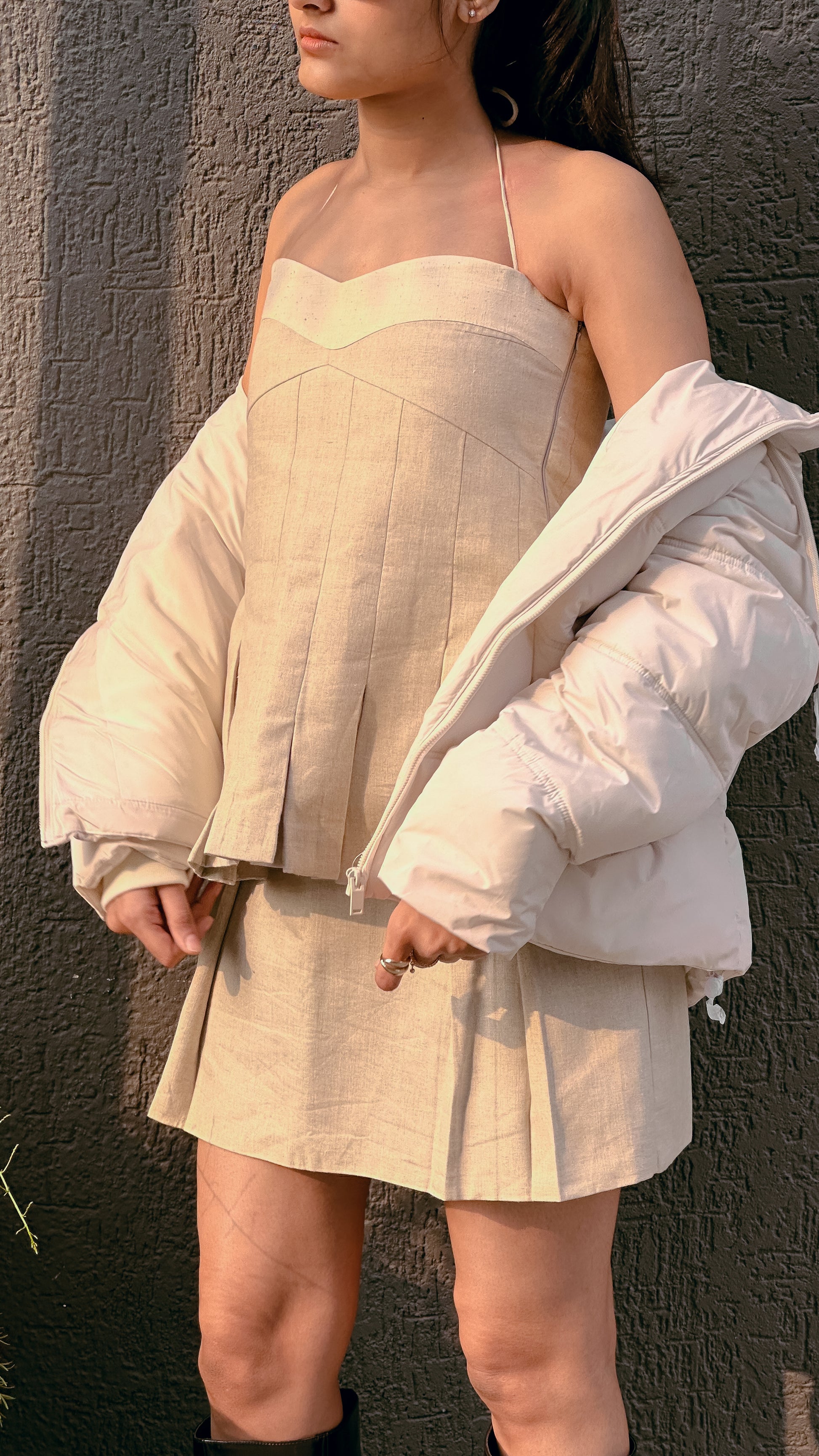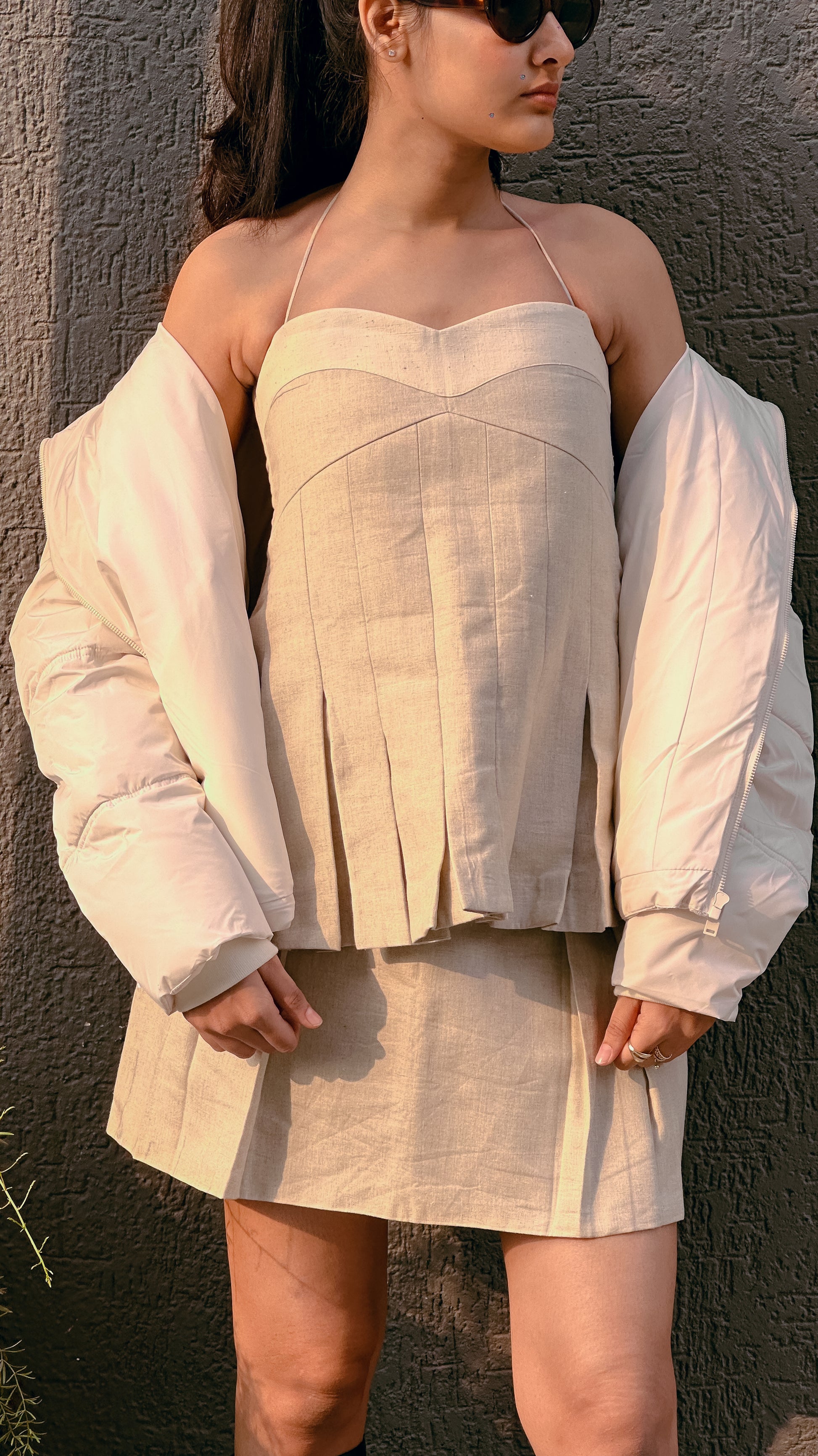Pleated top with side zip opening. Halter neck with a tie detailing around the neck.