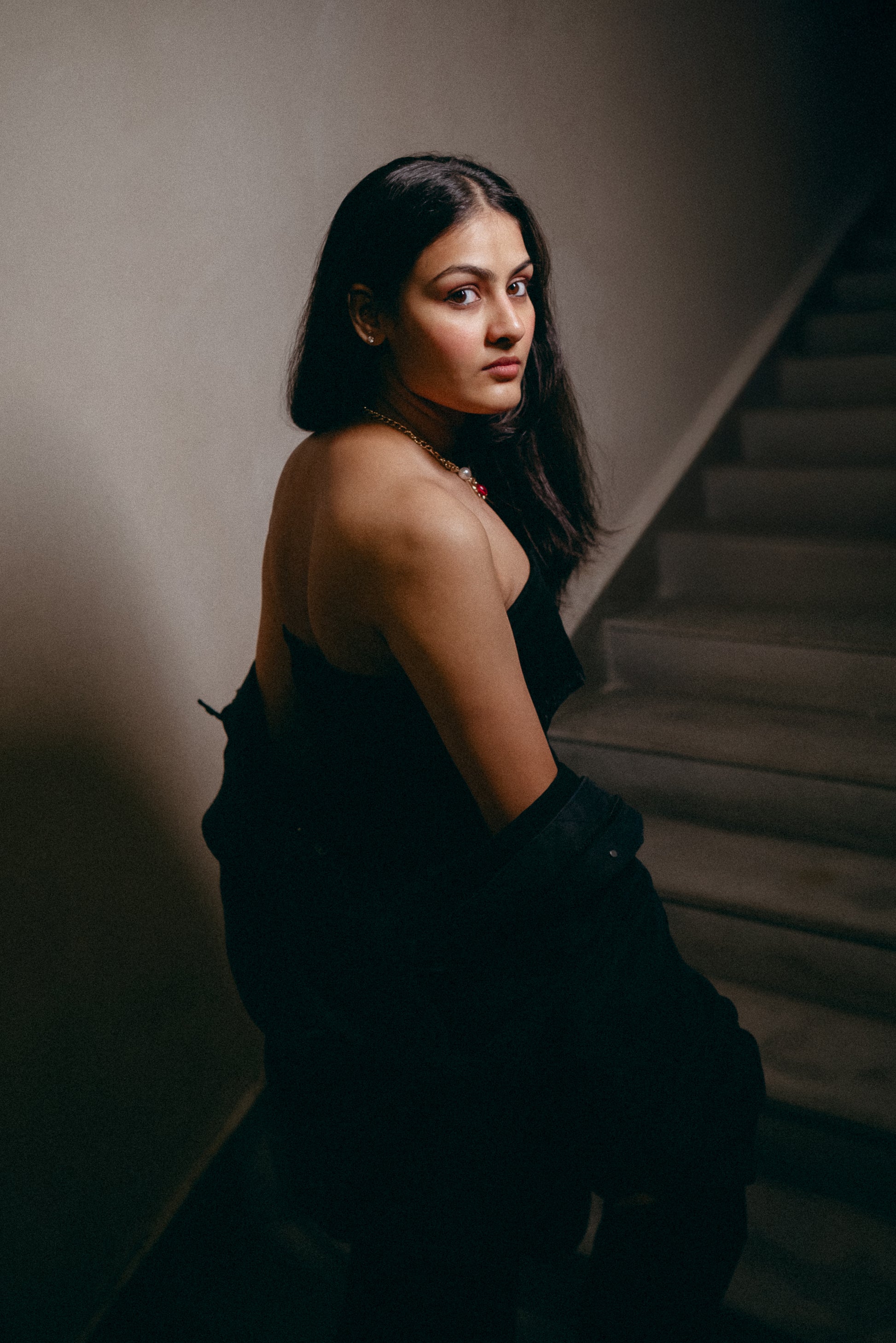 Fitted top with an off-shoulder design. Attached flap on the front with zip fastening concealed at the back.