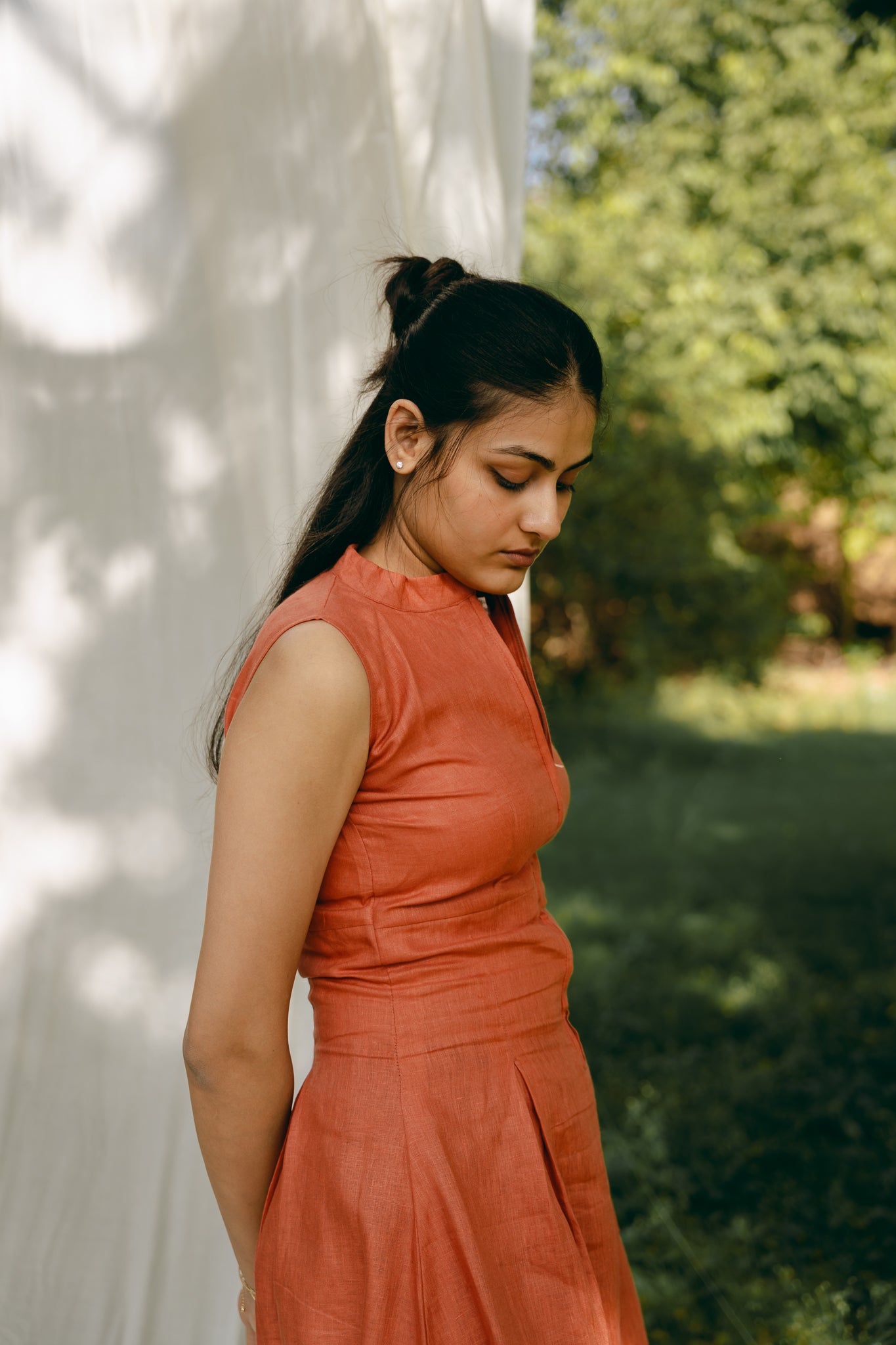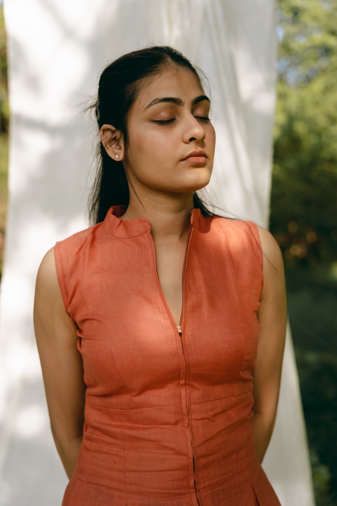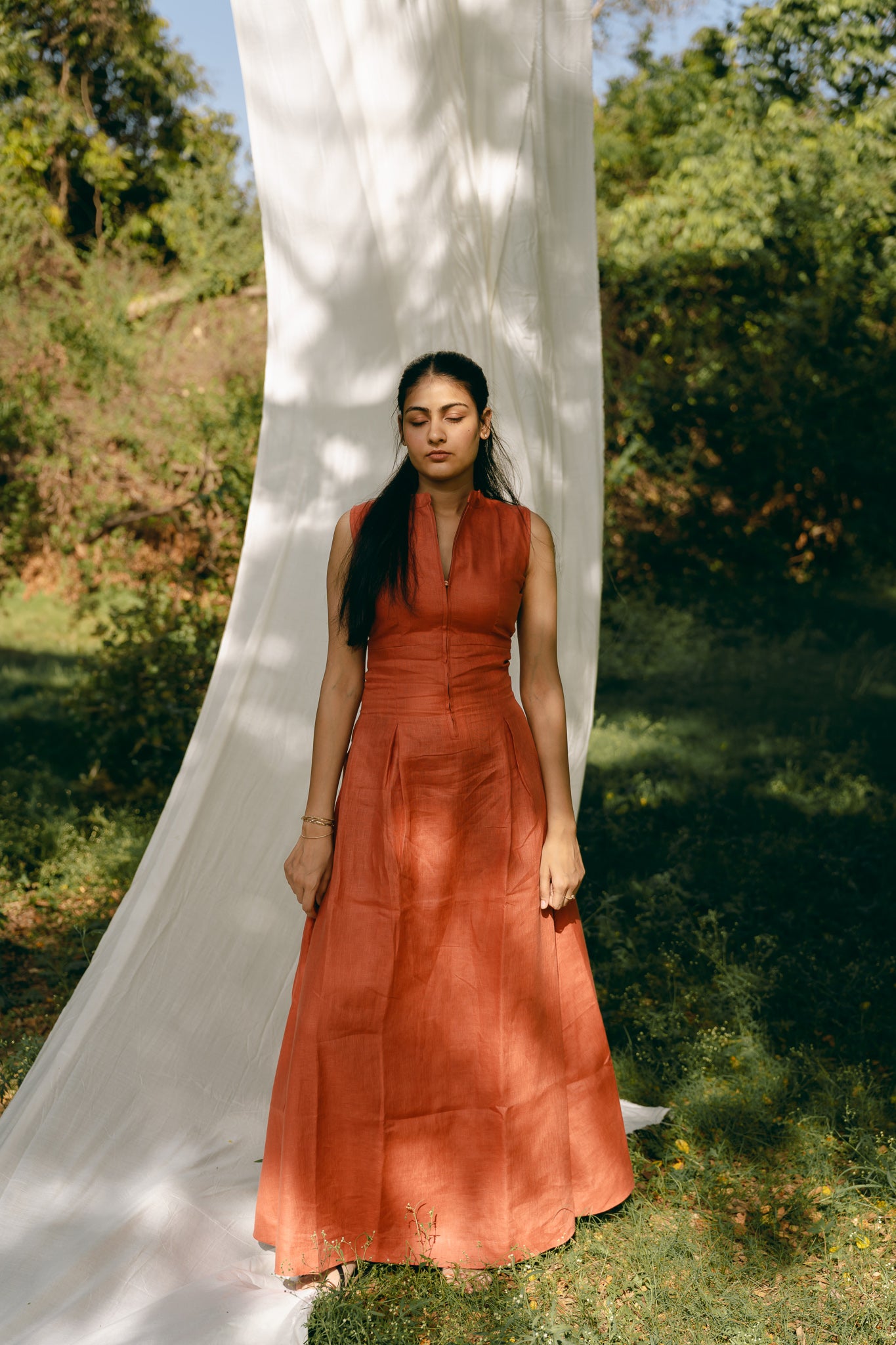 Sleeveless long dress with mandarin collar. Hidden zip fastening on the front.