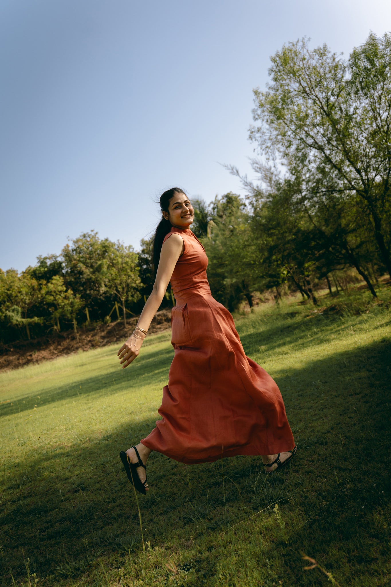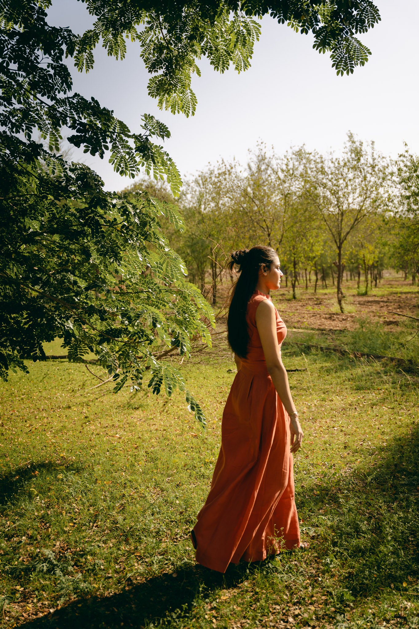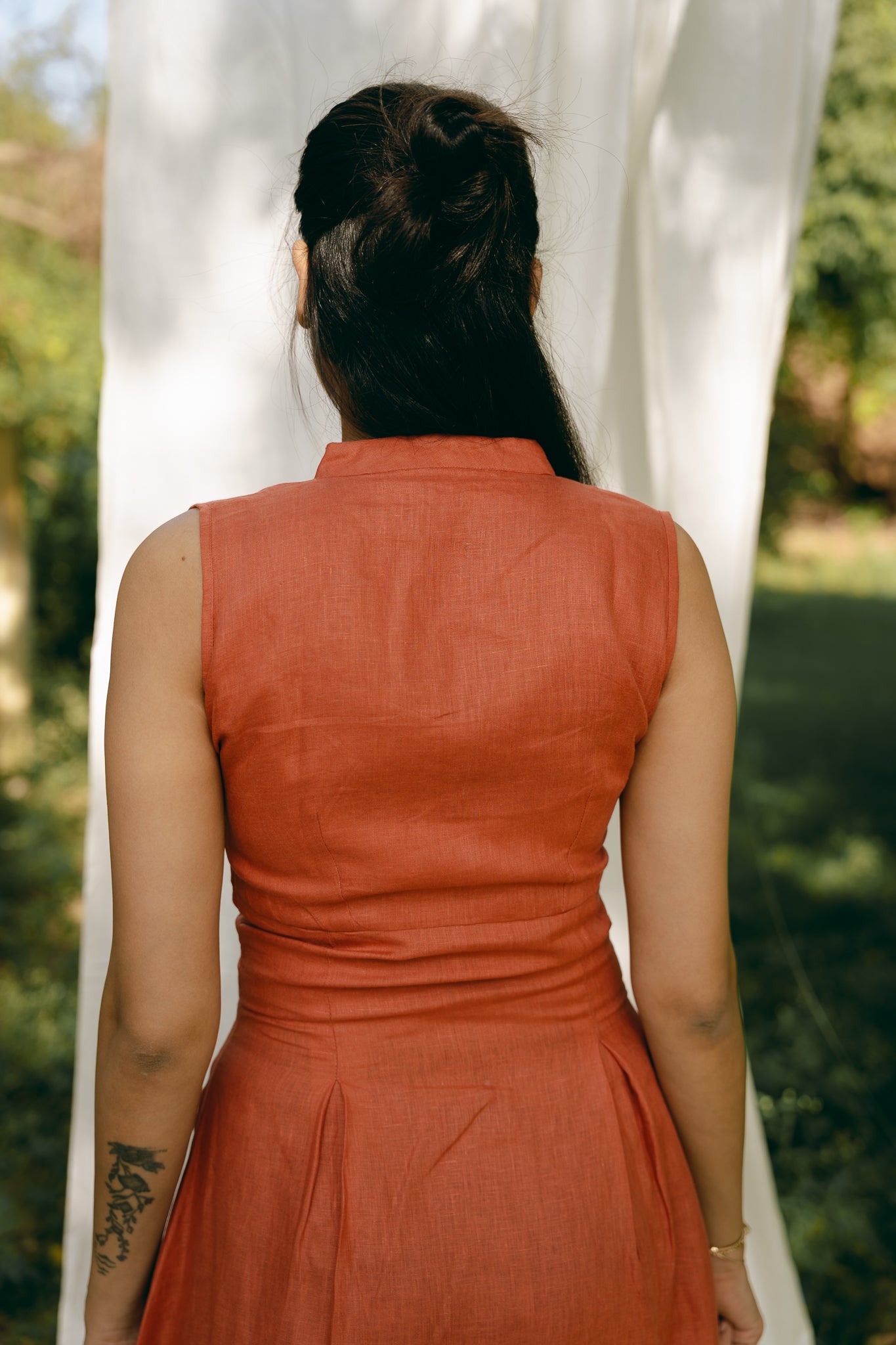 Sleeveless long dress with mandarin collar. Hidden zip fastening on the front.