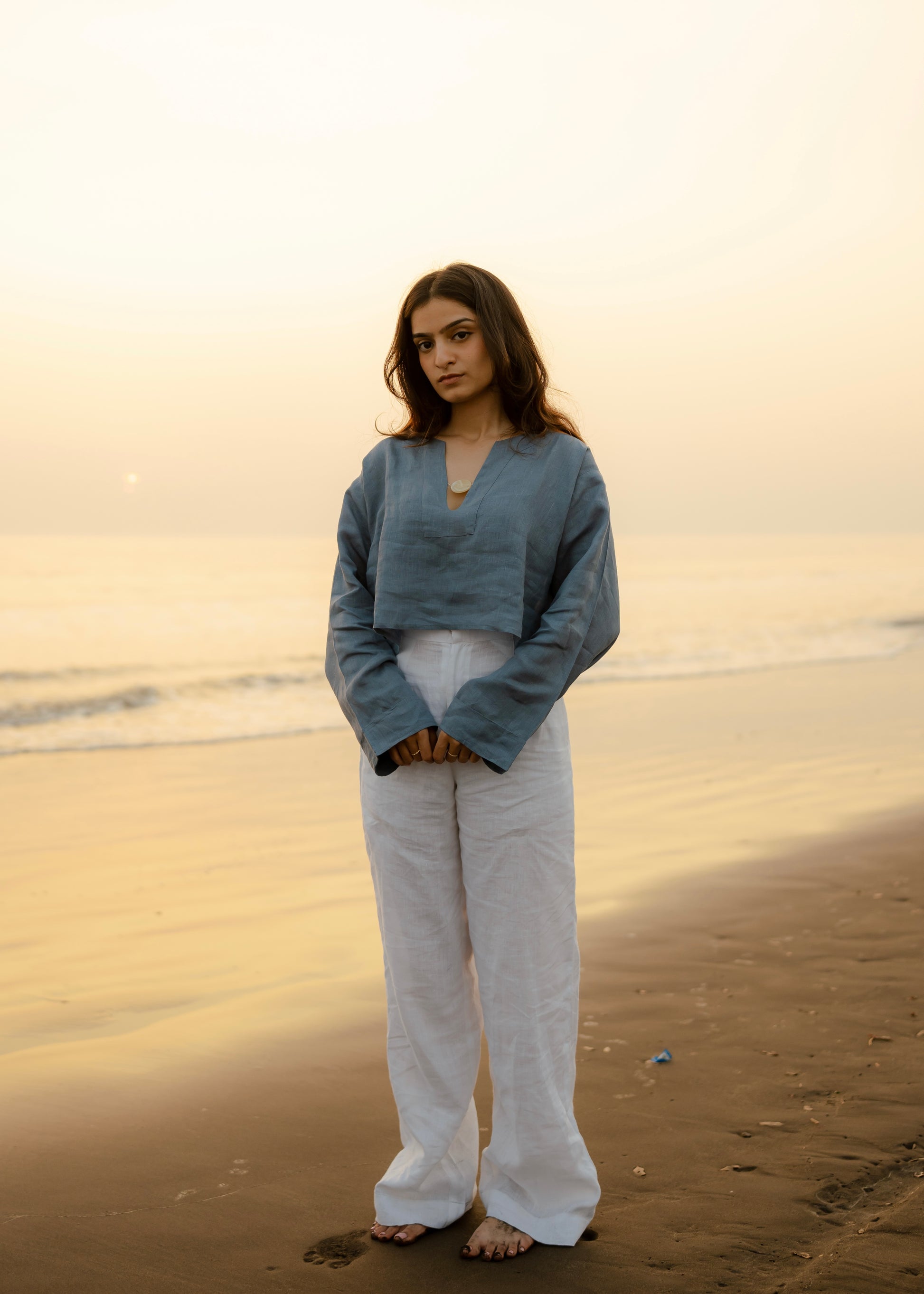 An oversized long sleeves crop top with a deep V-neckline and a statement button.