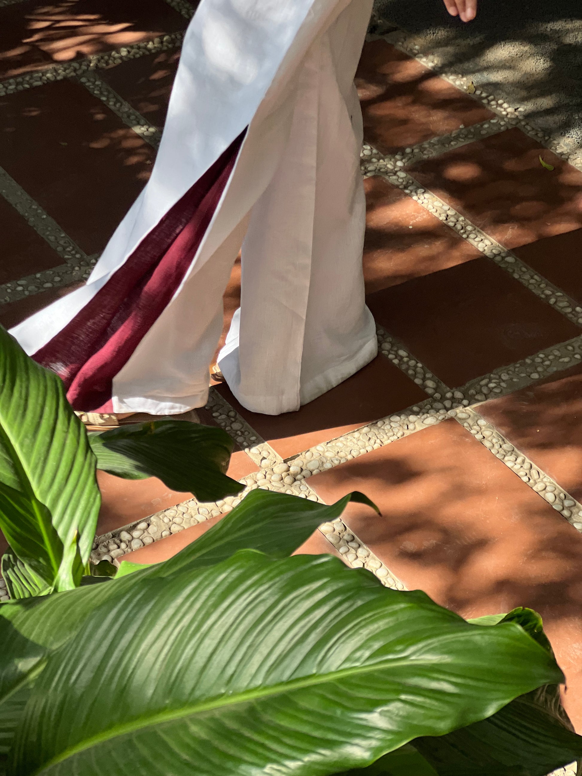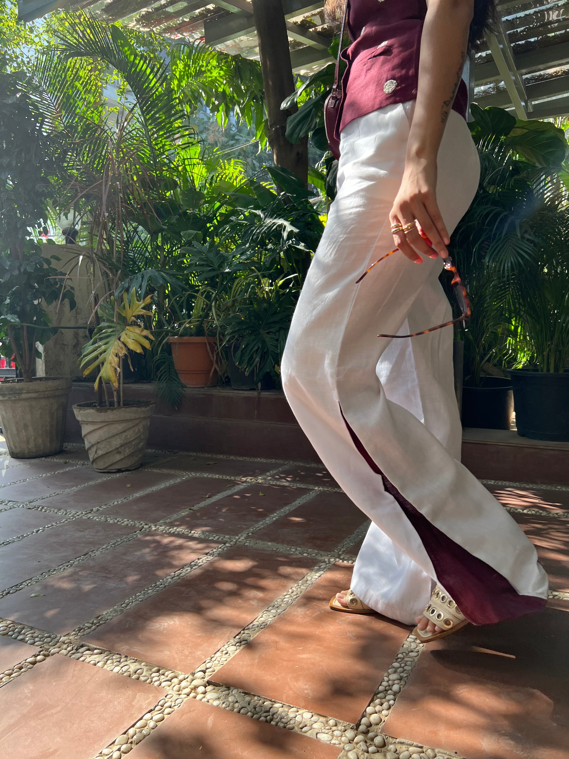 High-waisted extra wide-leg pants. Zip fastening concealed on the front. Side pockets and contrast maroon pleat near the hem.