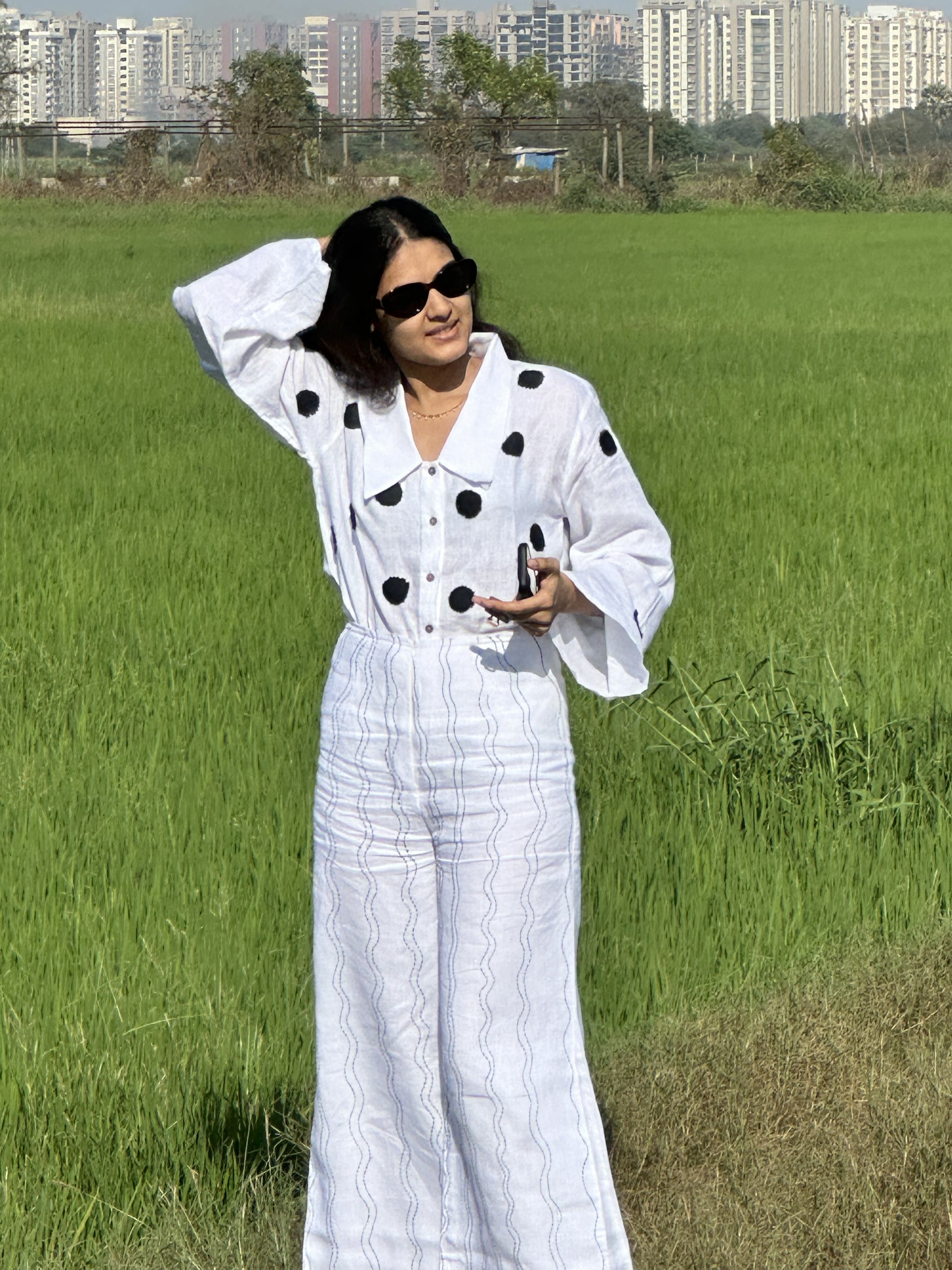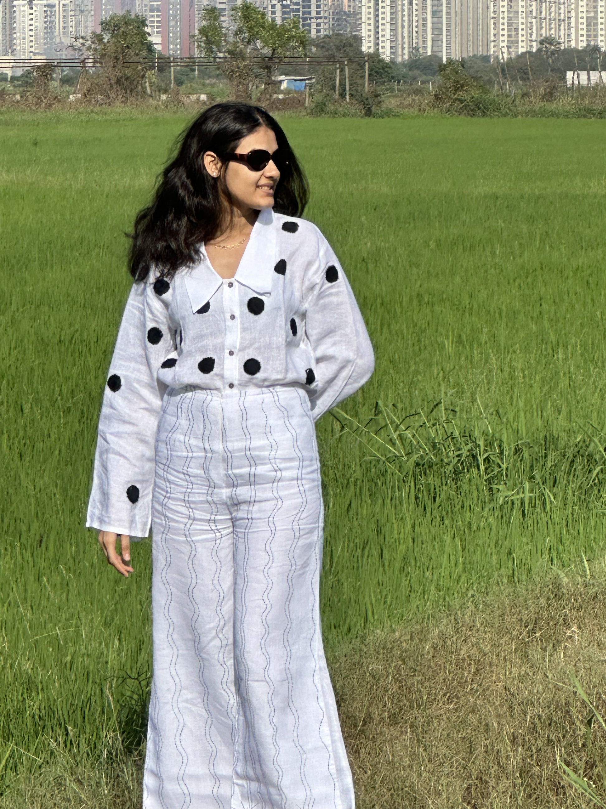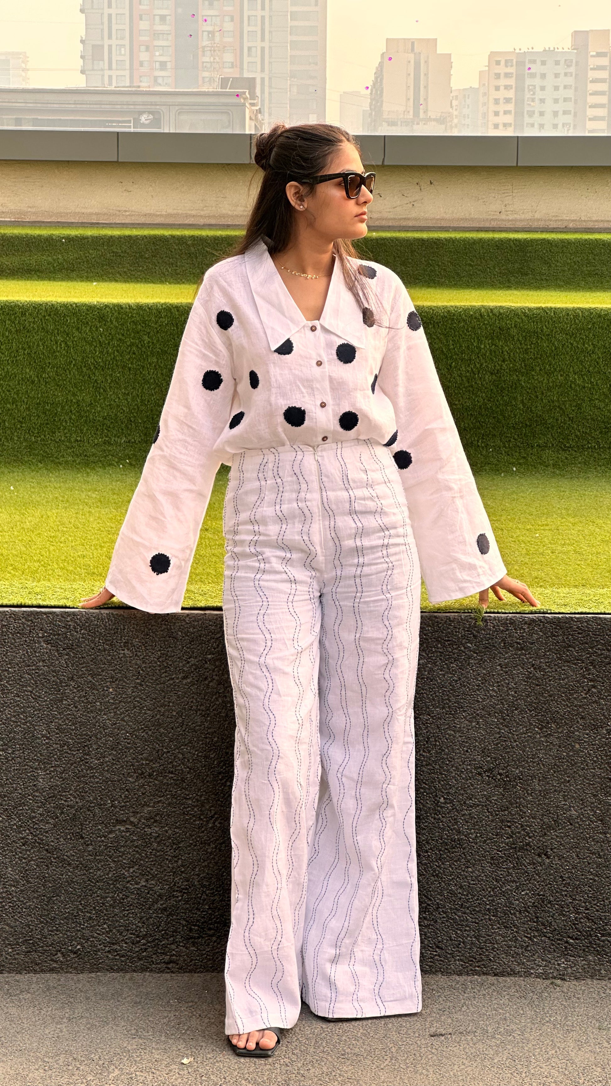 Full-sleeve shirt with a Chelsea collar, featuring patch detailing accented with knot embroidery. Designed with a button-up front and paired with high-waisted wide-leg pants. Finished with hand embroidery and a centre zip fastening at the front.