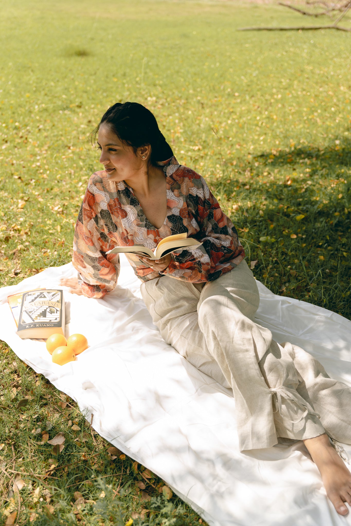 Deep V- neck top with long puffed sleeves and a thin cuff. Paired with high-waisted wide leg trousers. Drawstrings near the hem. Zip fly and metal hook fastening. Comes with a printed belt. Statement wooden button detailing.